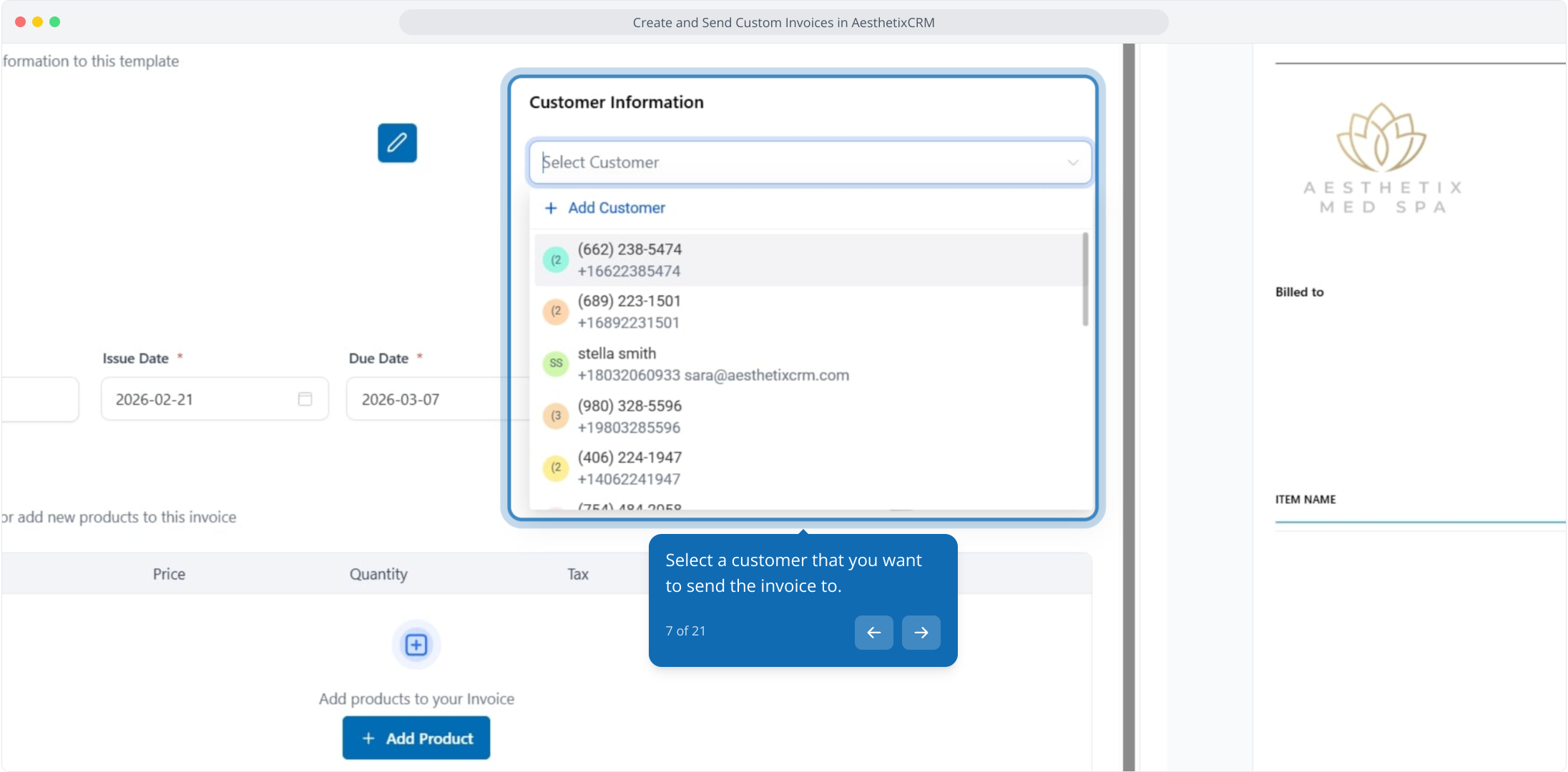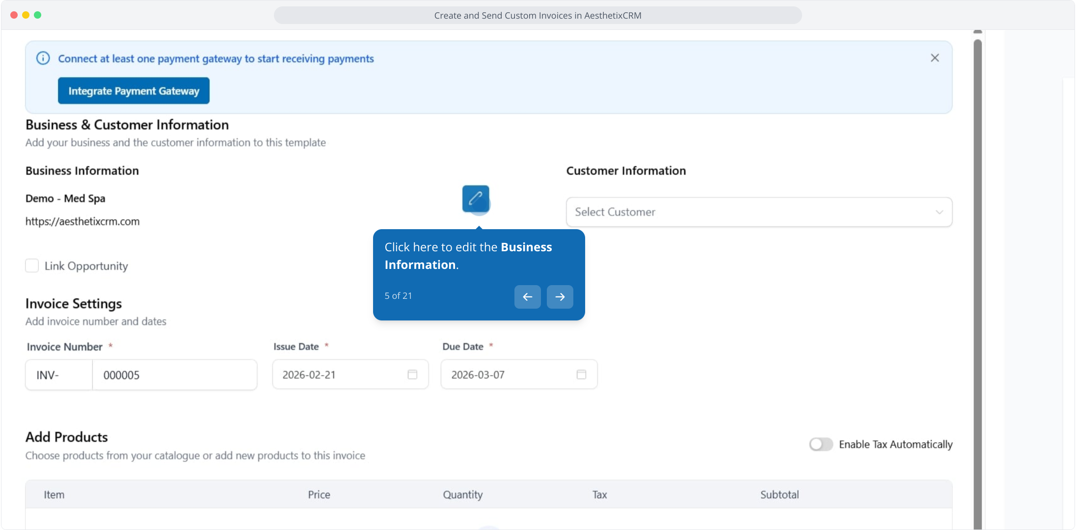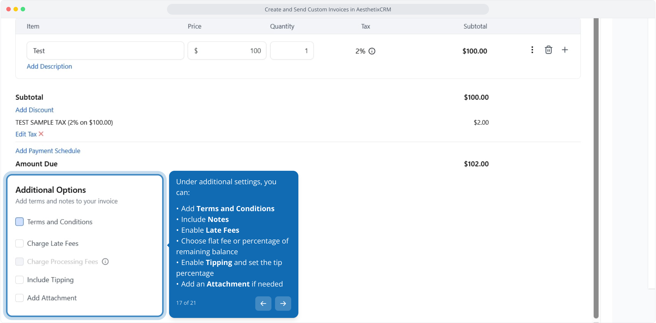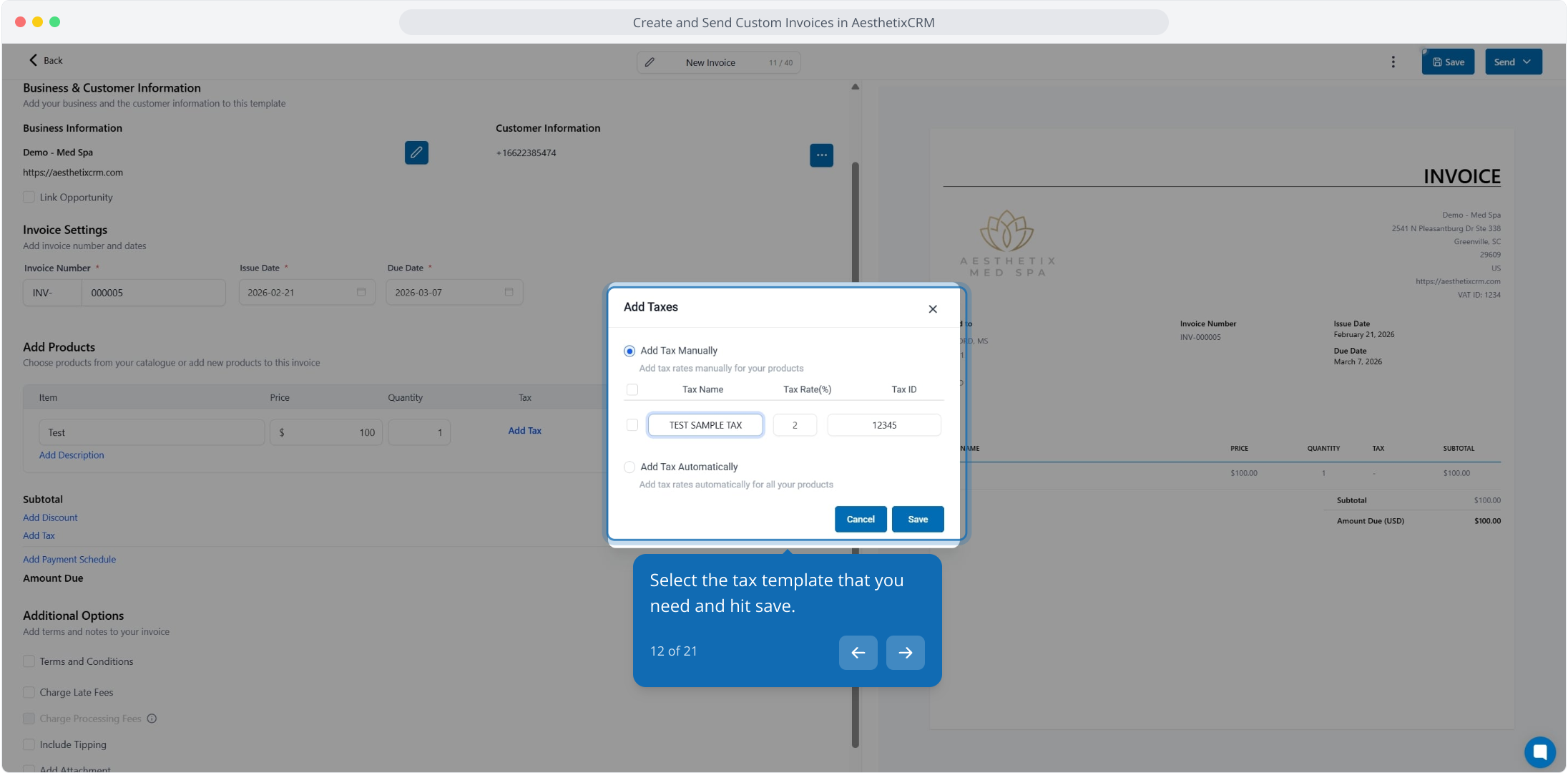 11. Next up, click Add Tax to apply tax charges to the invoice item. This is optional