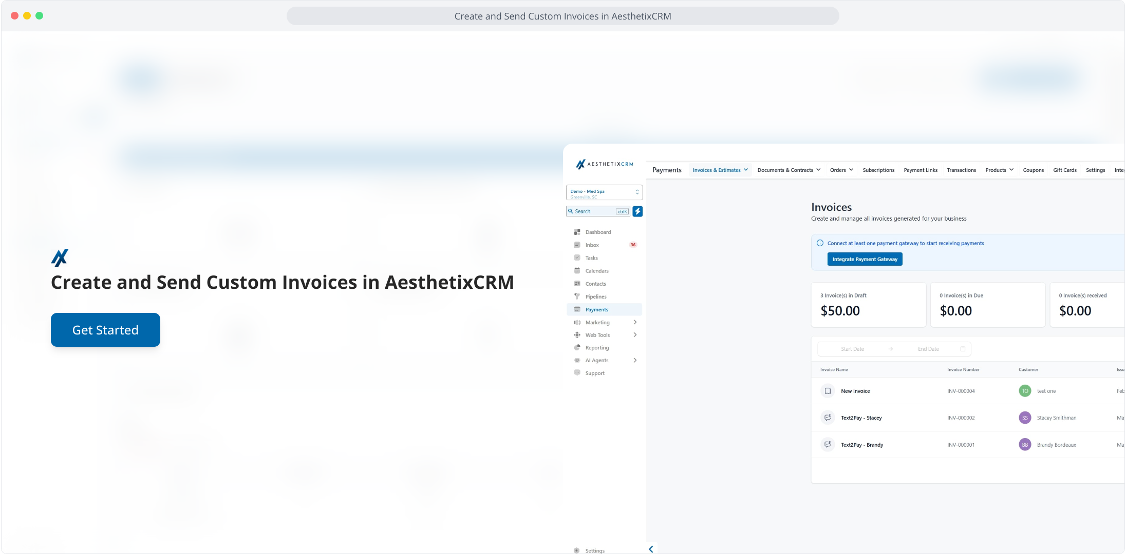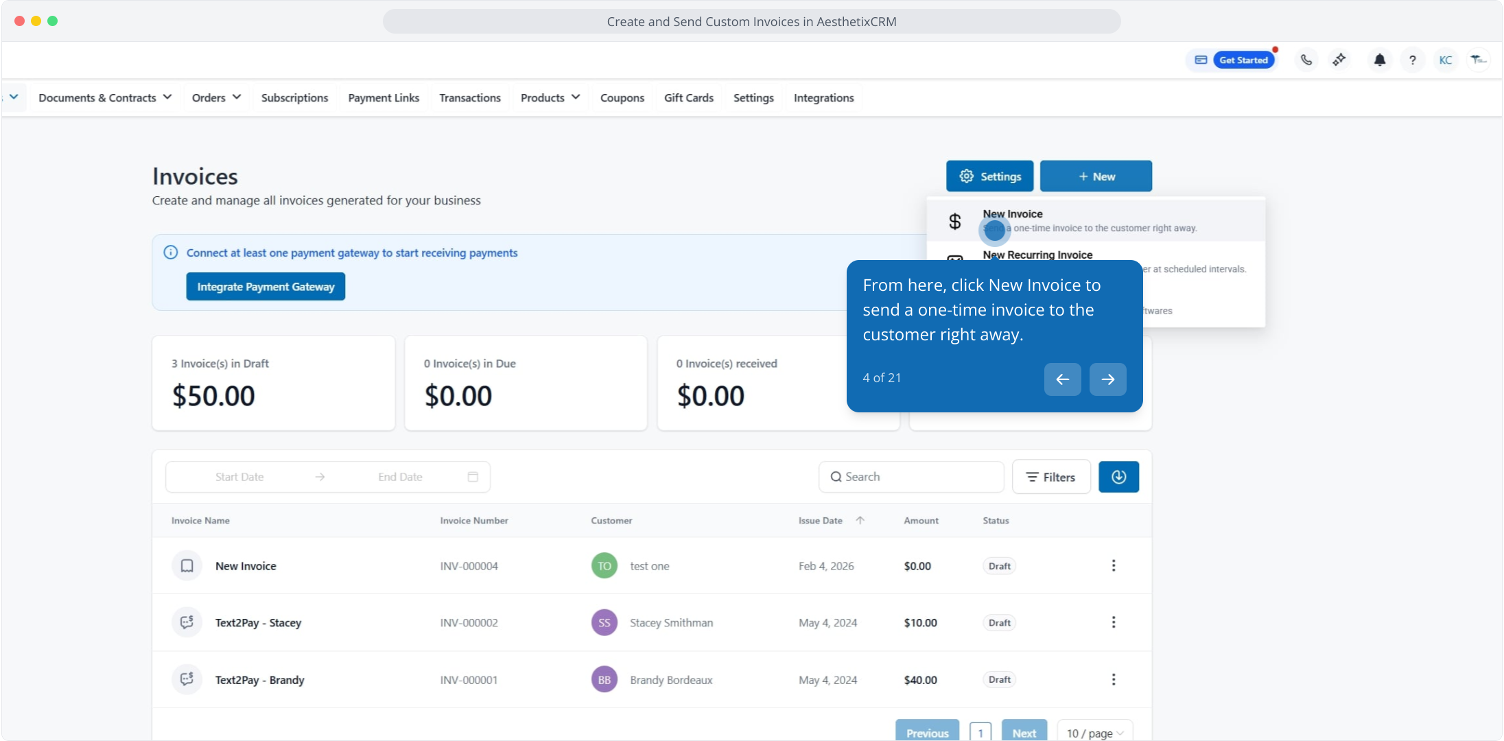 4. From here, click New Invoice to send a one-time invoice to the customer right away.