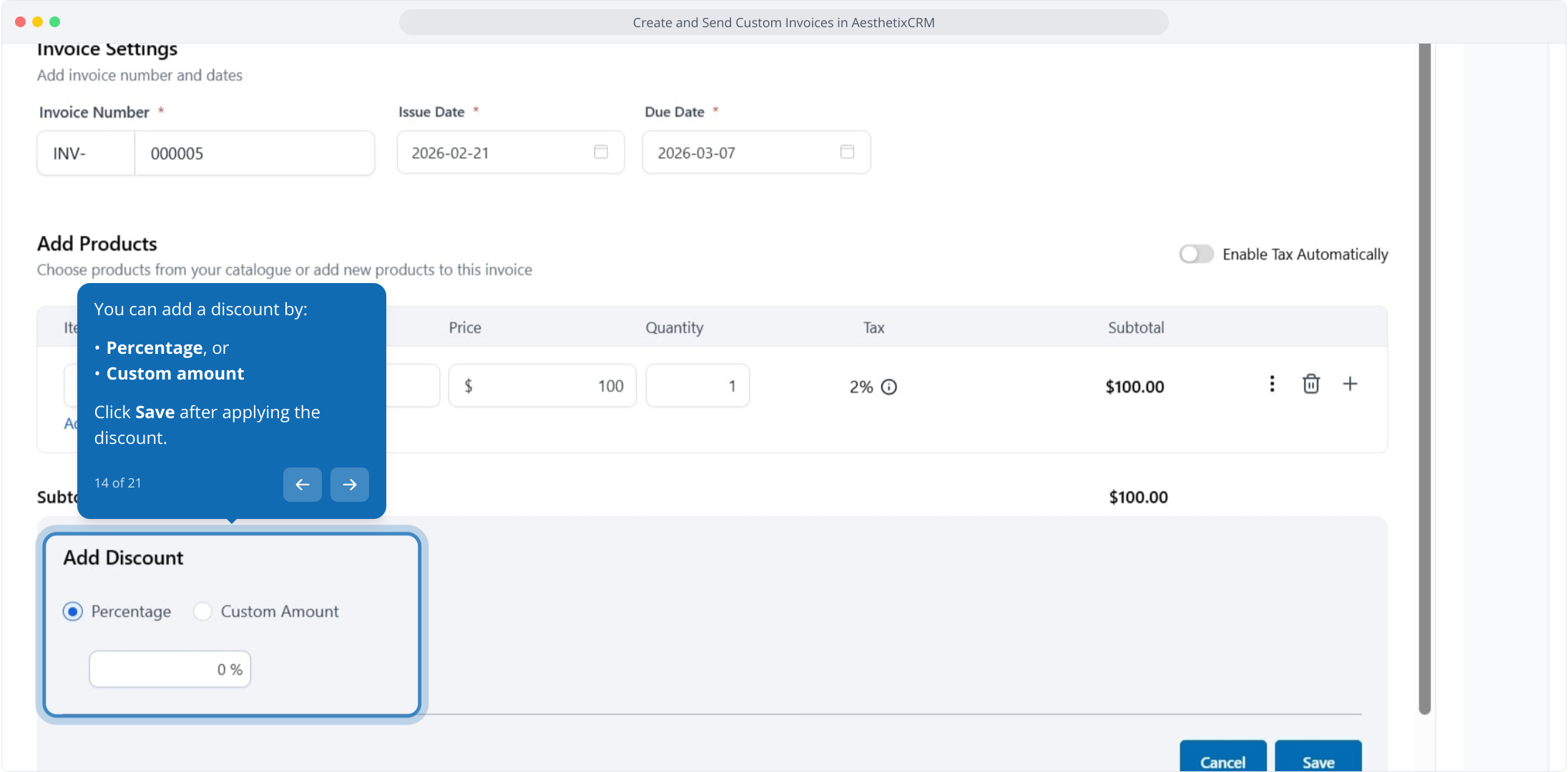 13. Following that, click the Add Discount link to apply a discount to the invoice.