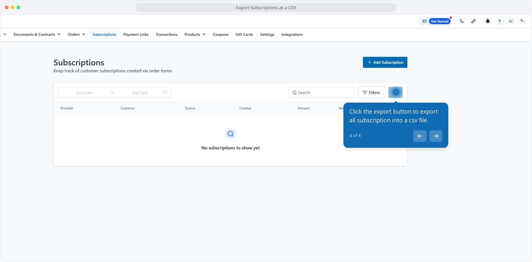3. Following this, click the Subscriptions tab to manage recurring billing.