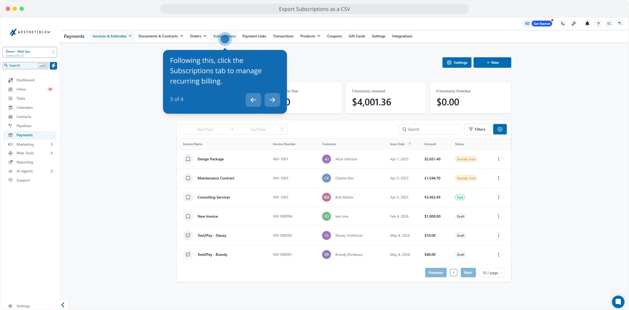 1. Manage Subscriptions and Filter Billing in Aesthetix CRM