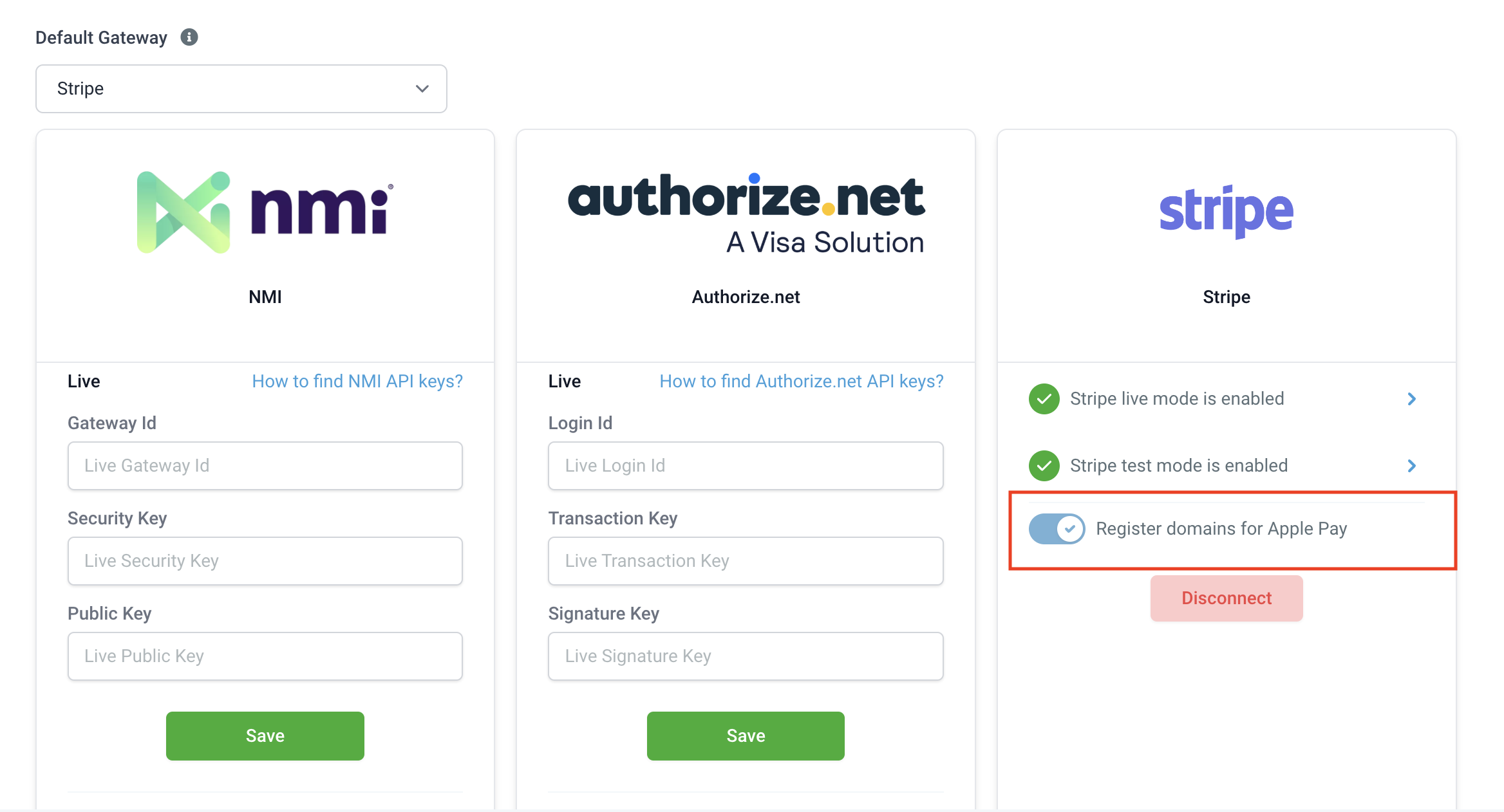 There might be a case that the browser is not up to date, Apple Pay and Google Pay are not supported in the customer's country or a relevant credit card has not been added to the customer's Apple/Google account. No option to pay via Apple Pay or Google pay will appear in that case. But the customer will still be able to see the credit card option to pay Using Stripe Connect under the Payments ➝ Integrations page is the primary requirement. If you're using Stripe APIs to connect to Stripe, please use Stripe Connect to use this feature. Once you have connected your Stripe account in Payments> Integrations, a toggle is provided to enable Apple Pay and Google Pay on the order forms.
