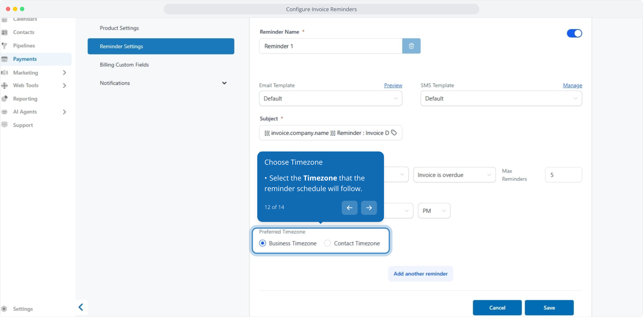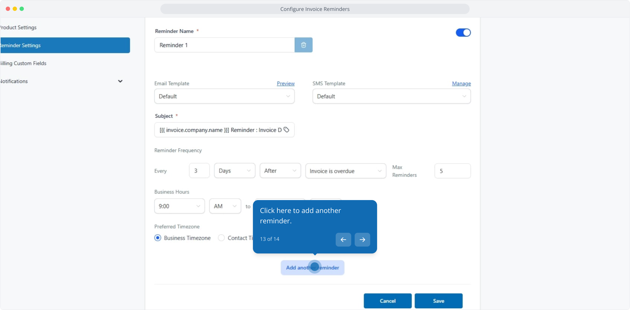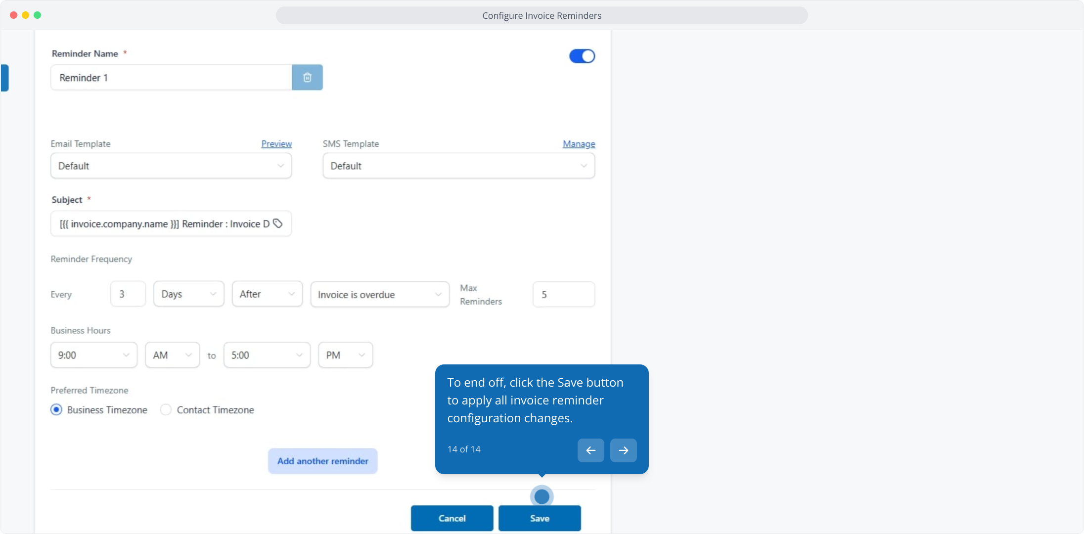 7. From here, enter your preferred reminder name to customize the invoice reminder label.