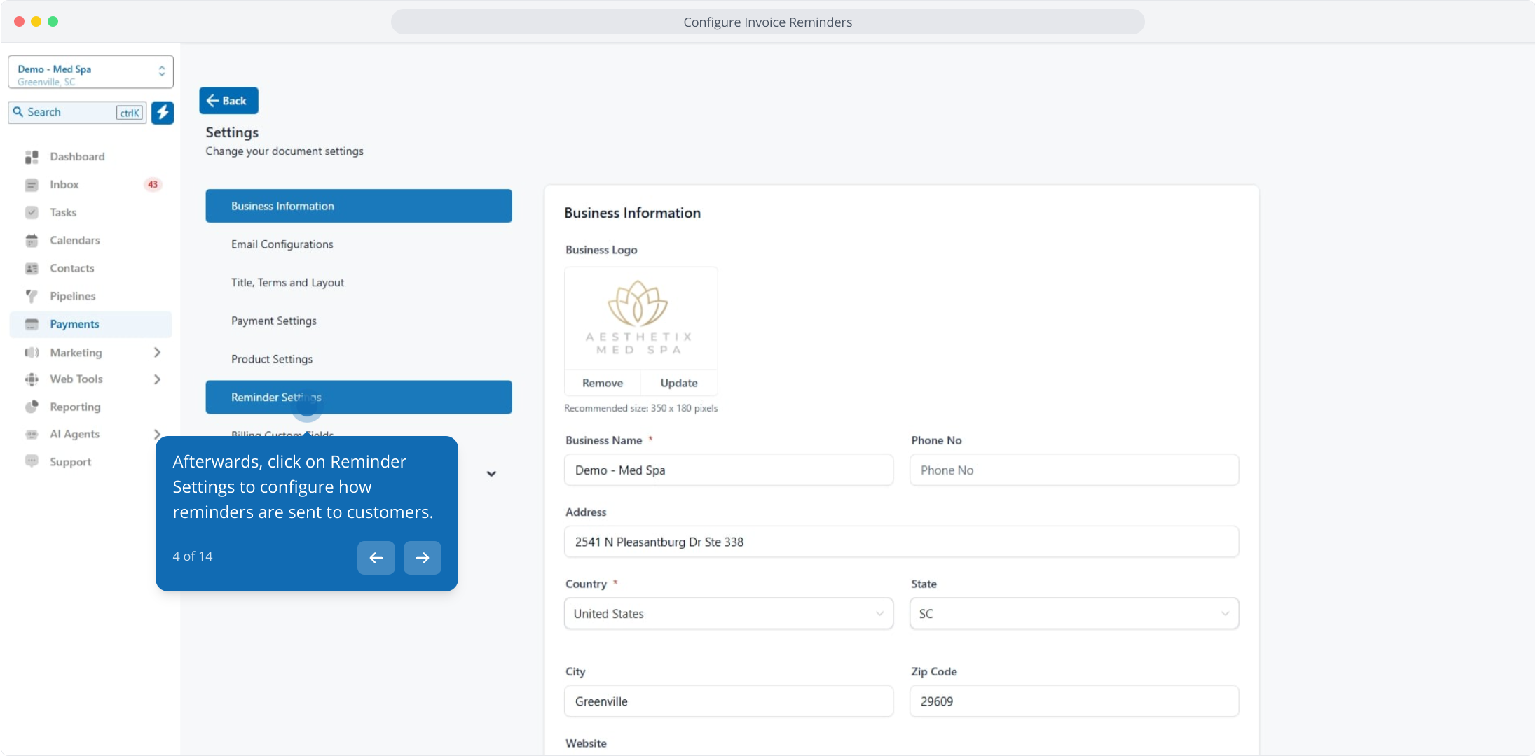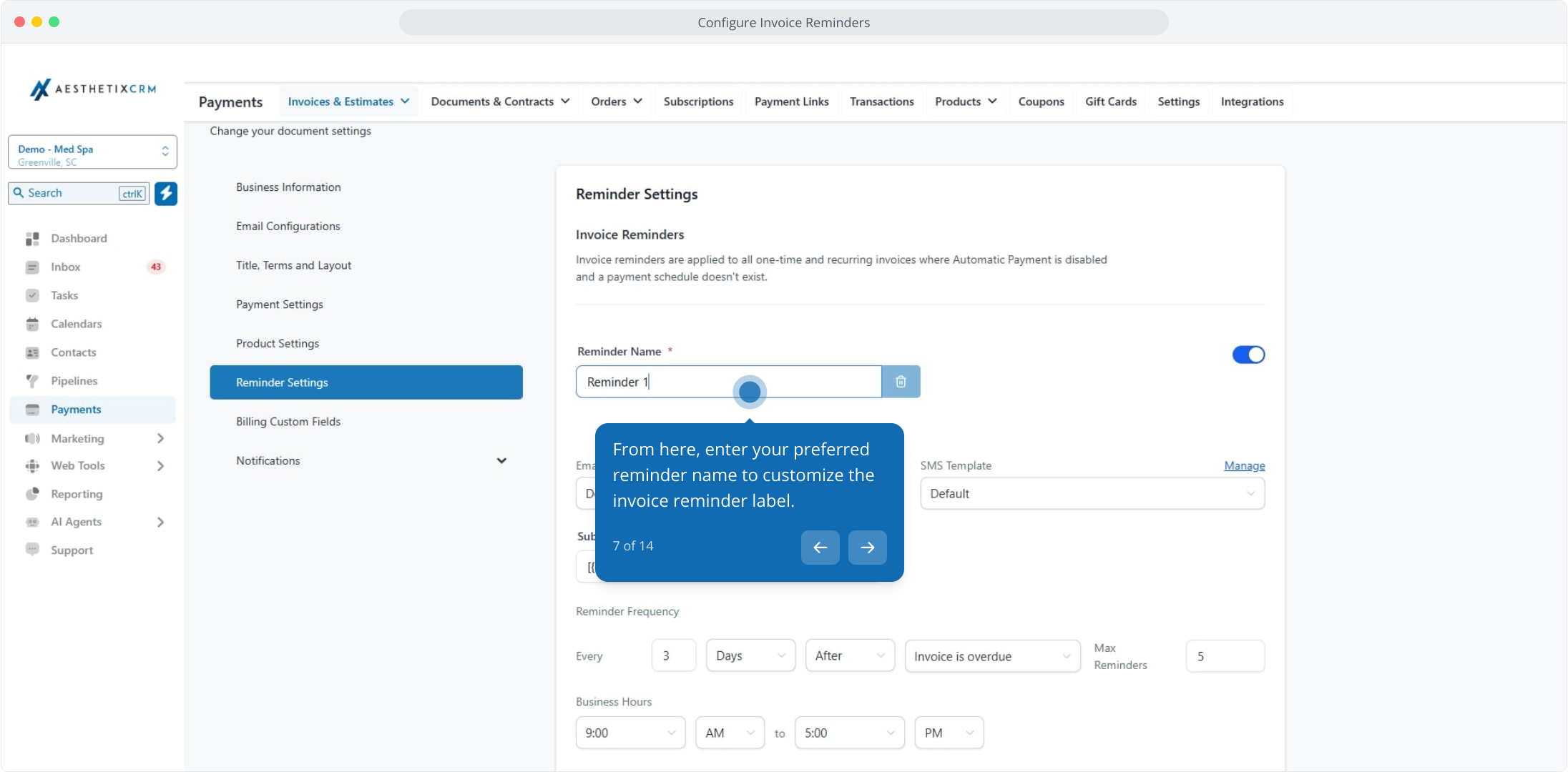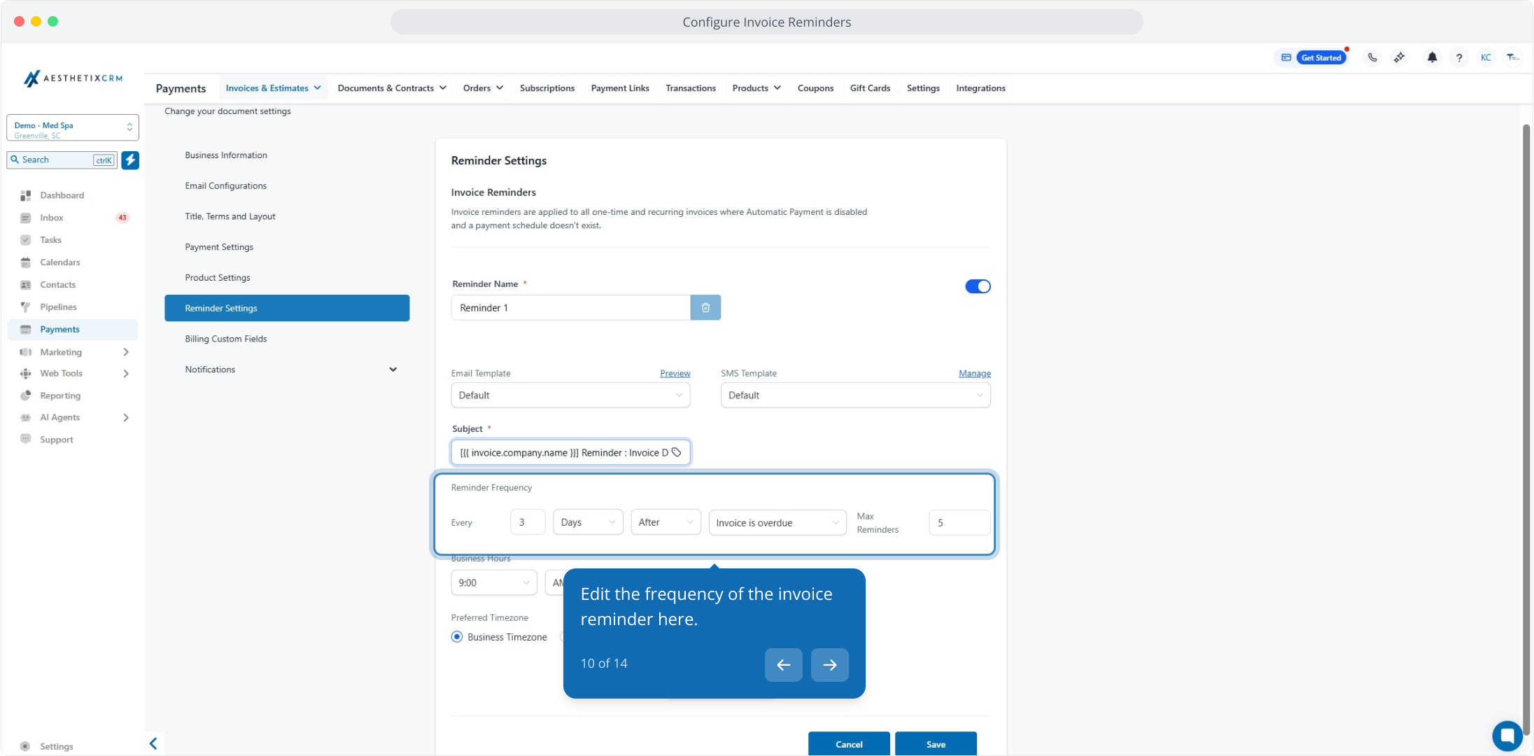1. Configure Invoice Reminders in Aesthetix CRM