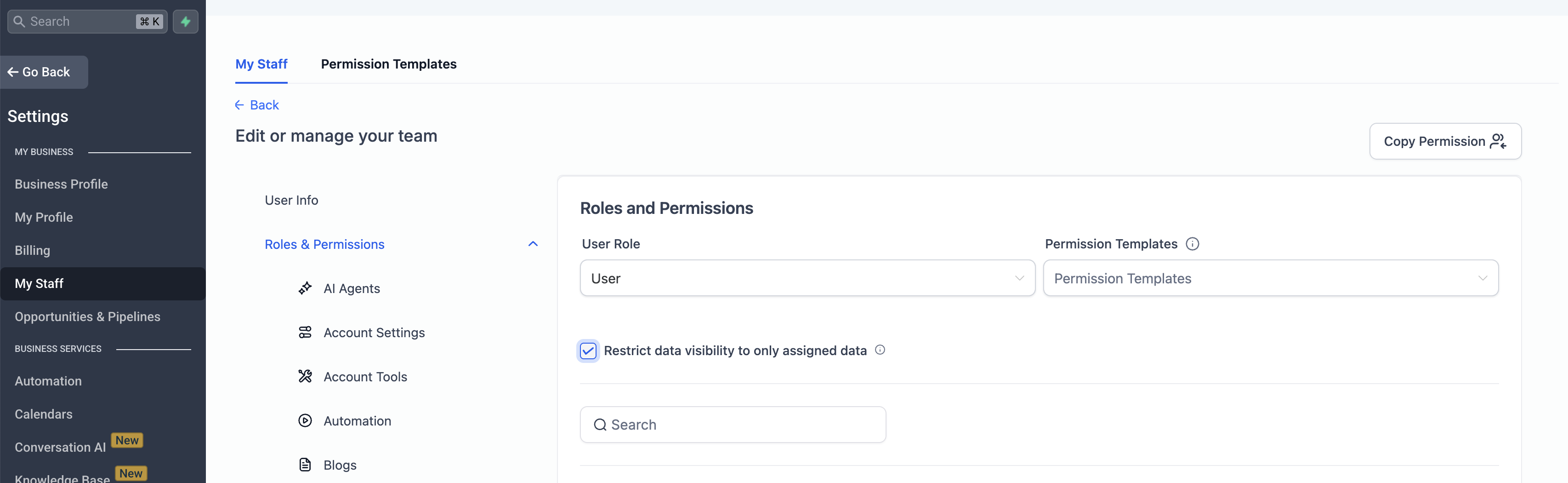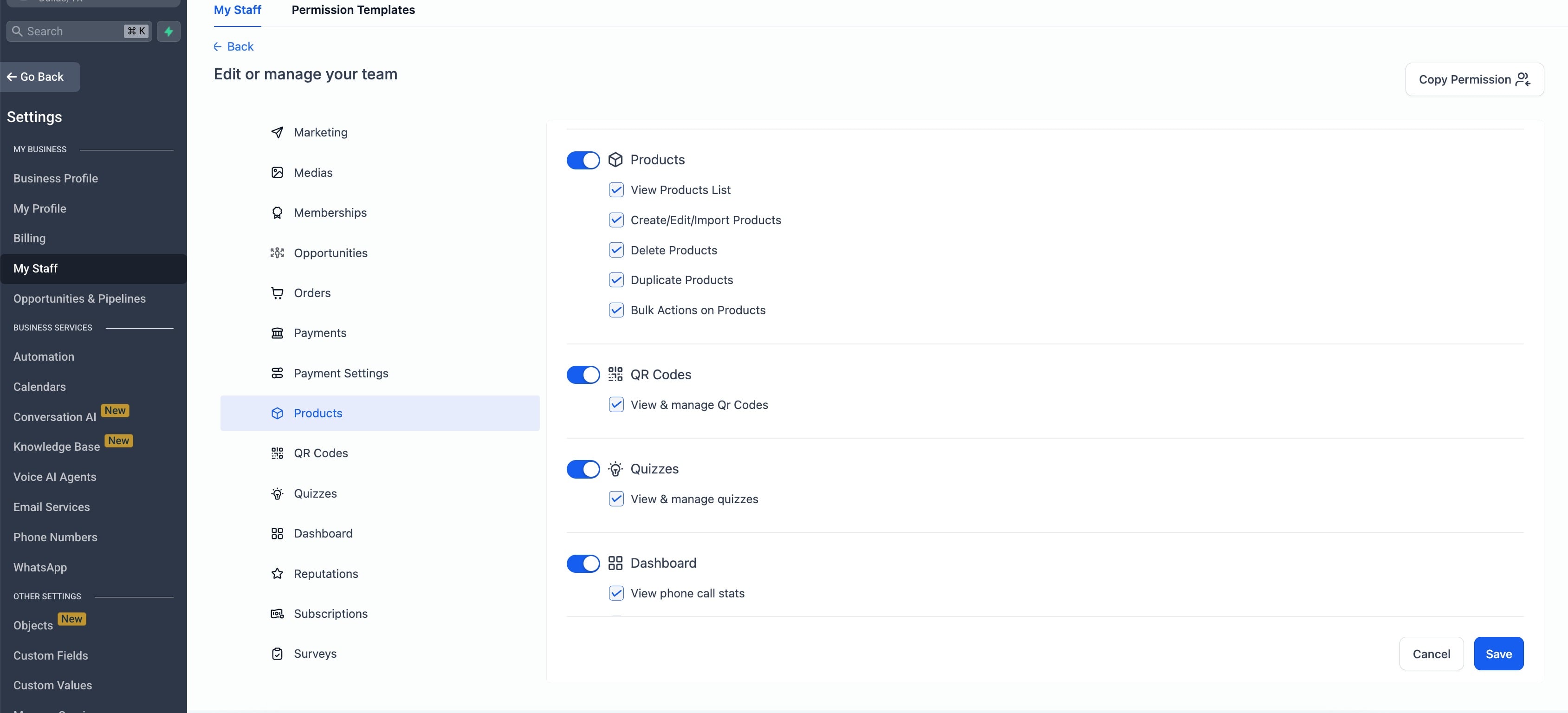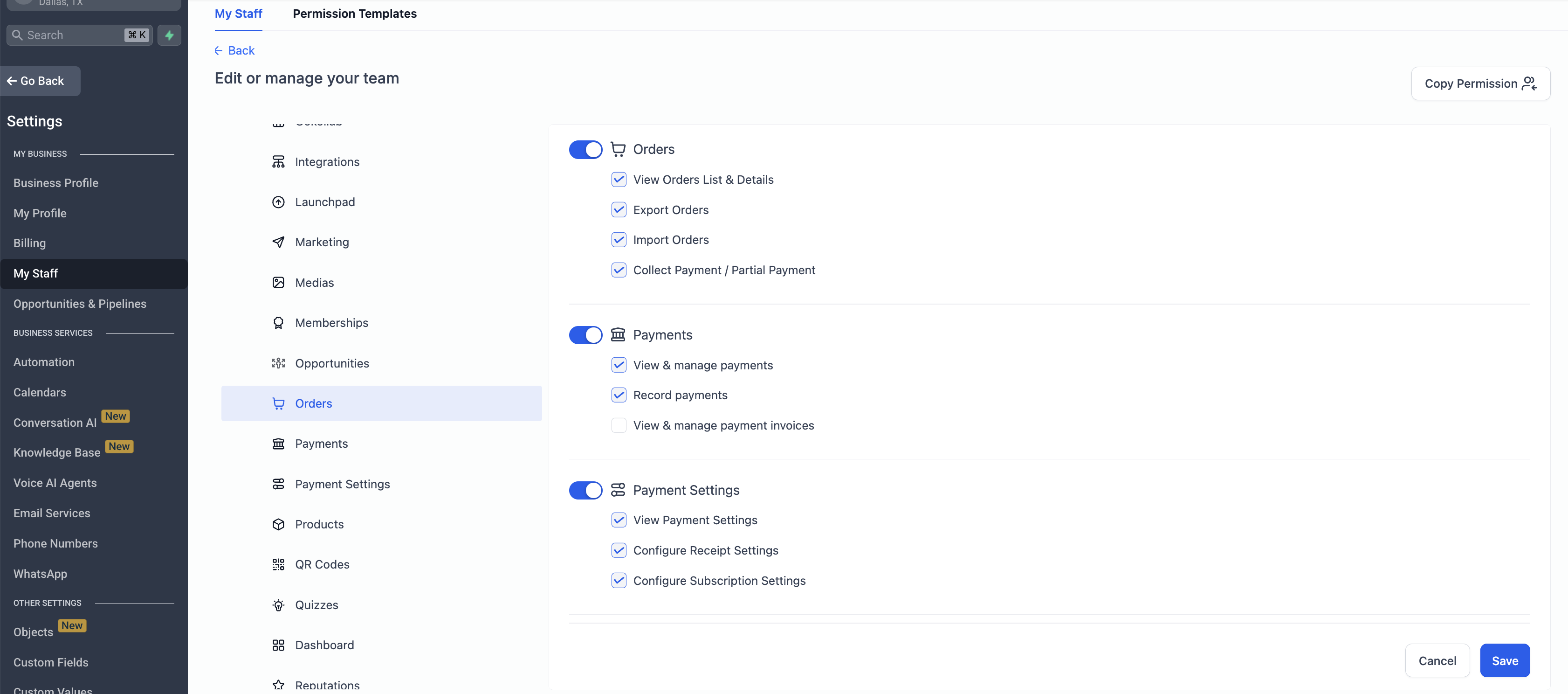 Settings → My Staff → Edit Staff Member → Roles & Permissions
