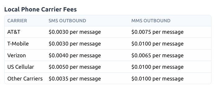 Depending on the recipient carrier, you will also see phone carrier fees. These fees may vary by message type (MMS or SMS) and phone number type (local or toll-free).